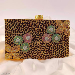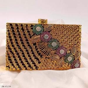 Handcrafted 22k gold plated clutch studded with ruby, emerald and pearls.