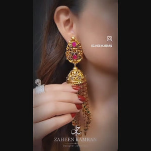 Handcrafted 22k gold plated danglers adorned with ruby and emerald