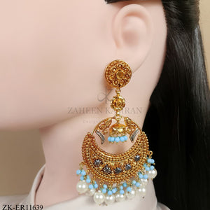Handcrafted 22k gold plated earrings adorned with feroza and pearls.