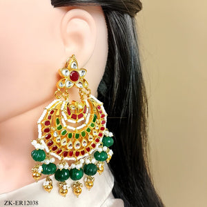 Handcrafted 22k gold plated earrings studded with emerald, pink zirconia, kundan and pearls.
