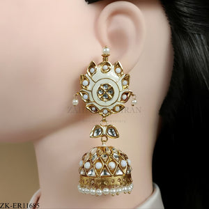 Handcrafted 22k gold plated earrings adorned with kundan, white Meena and pearls.