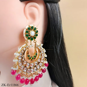 Handcrafted 22k gold plated earrings studded with kundan, emerald and pink zirconia.