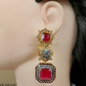 Handcrafted 22k gold plated earrings adorned with pink zirconia, smoky and coffee stones.