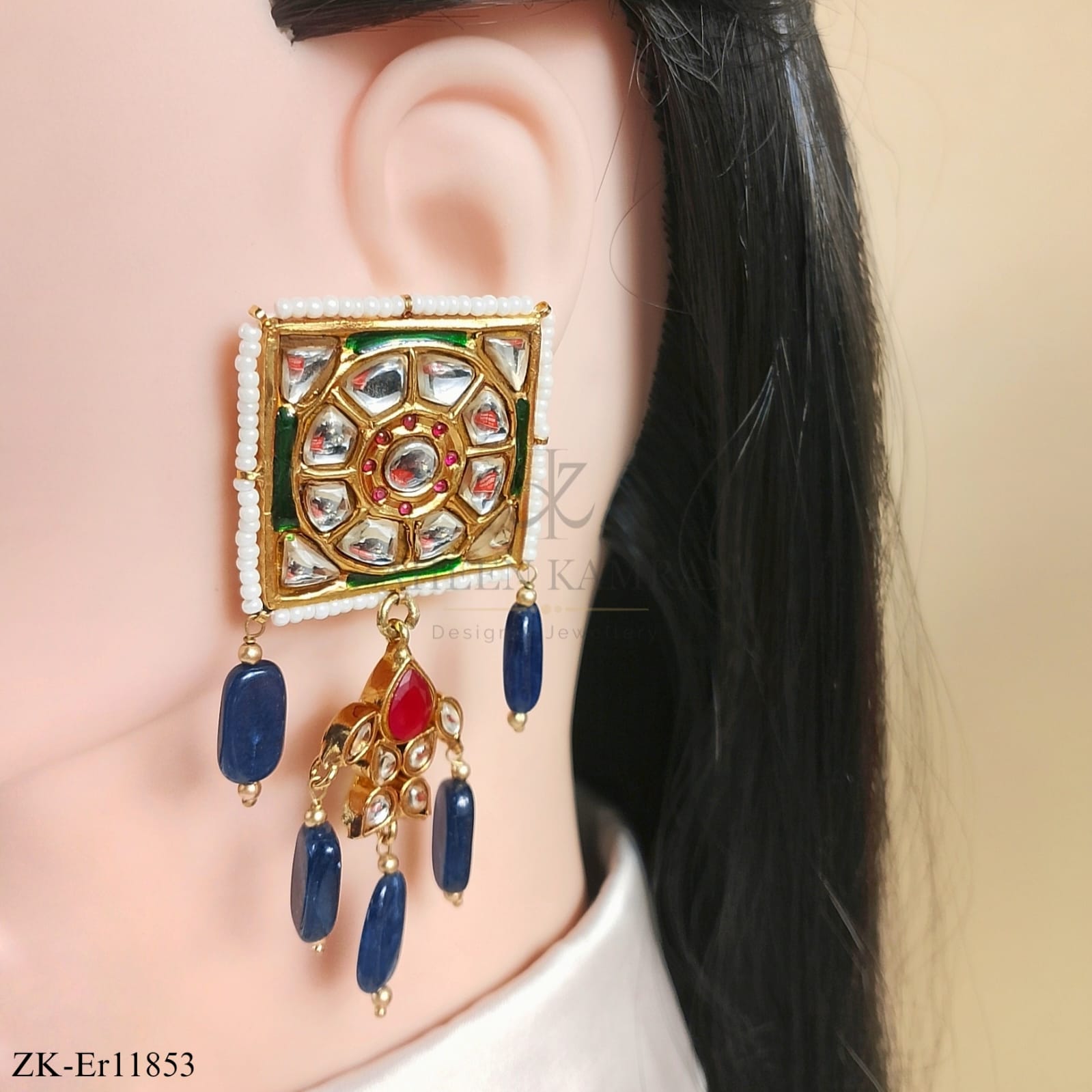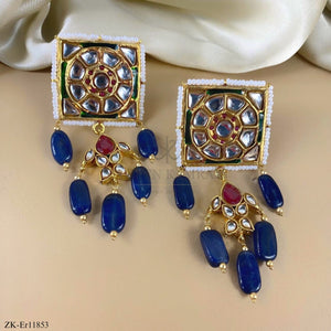 Handcrafted 22k gold plated earrings studded with sapphire, kundan and pearls.