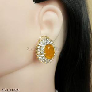 Elegant gold stud earrings featuring oval citrine centerpiece surrounded by double-halo zirconia in a square setting.