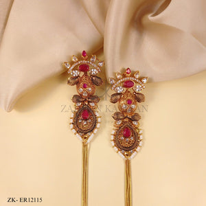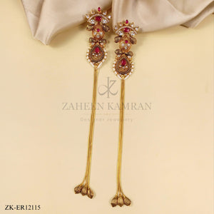 Elegant gold-tone long dangler earrings featuring ruby, white kundan stones & pearls with intricate filigree design and tassel chains.