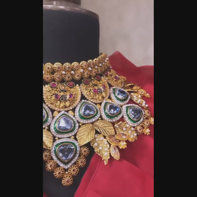 Handcrafted 22 k gold plated bridal necklace with earrings studded with pearls zircons and rubies