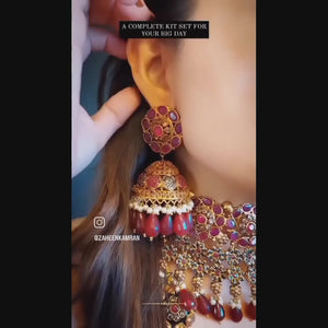 Handcrafted 22 k gold plated set with matching jhumki,nath,mala,tikka and Jhummar studded with champagne,smoky and rubies.