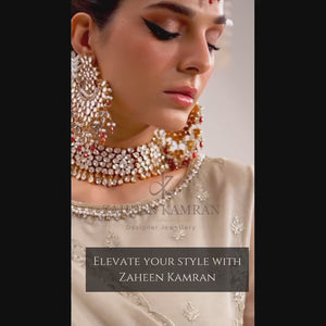 Handcrafted 22k gold plated necklace along with earrings studded with Diamond Polki Sheesh and Ruby Beads.
