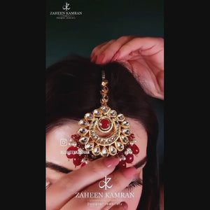 Handcrafted 22k gold plated necklace along with earrings and tikka adorned with sheesh, ruby, meena and white pearls