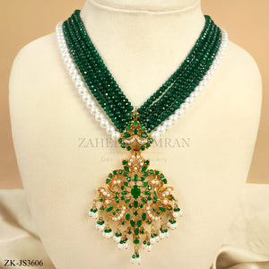 Handcrafted 22k gold plated mala adorned with emerald and pearls.