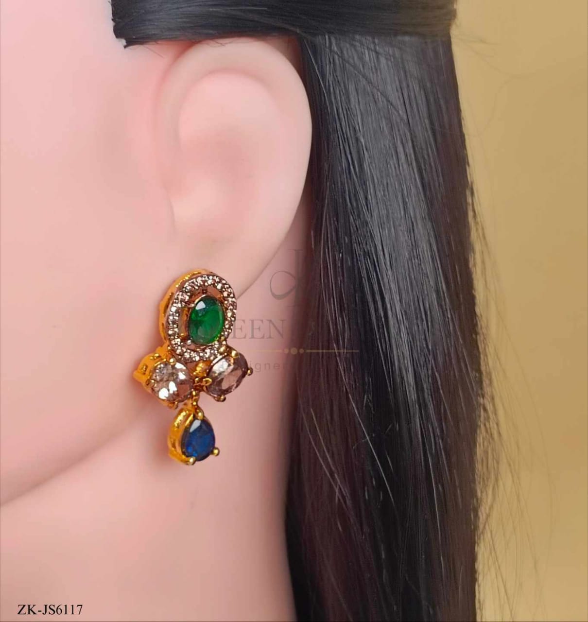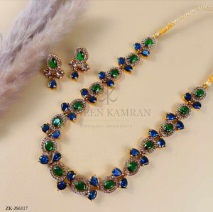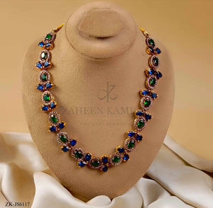 Handcrafted 22k gold plated mala alongside earrings studded with sapphire, emerald and zircons.