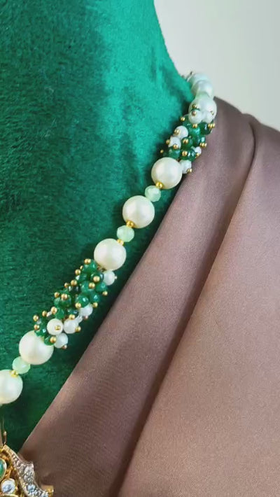 Handcrafted 22k gold plated mala alongside earrings studded with emerald, cut stones and zircons.