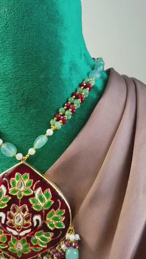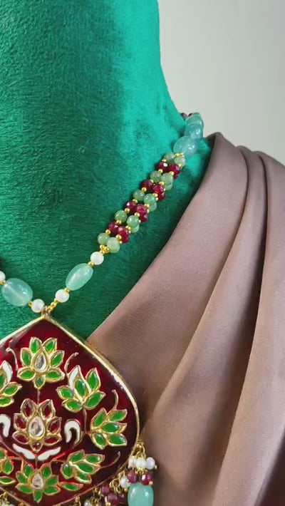 Handcrafted 22k gold plated mala alongside earrings studded with emerald, garnet and pearls.
