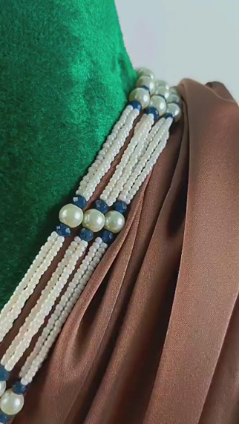 Handcrafted silver plated mala alongside earrings studded with emerald, white opals and pearls.