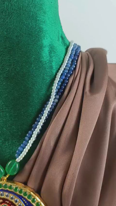 Handcrafted 22k gold plated mala alongside earrings studded with emerald, blue meena and pearls.