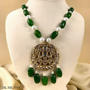 Handcrafted 22k gold plated mala studded with emerald, kundan and pearls.