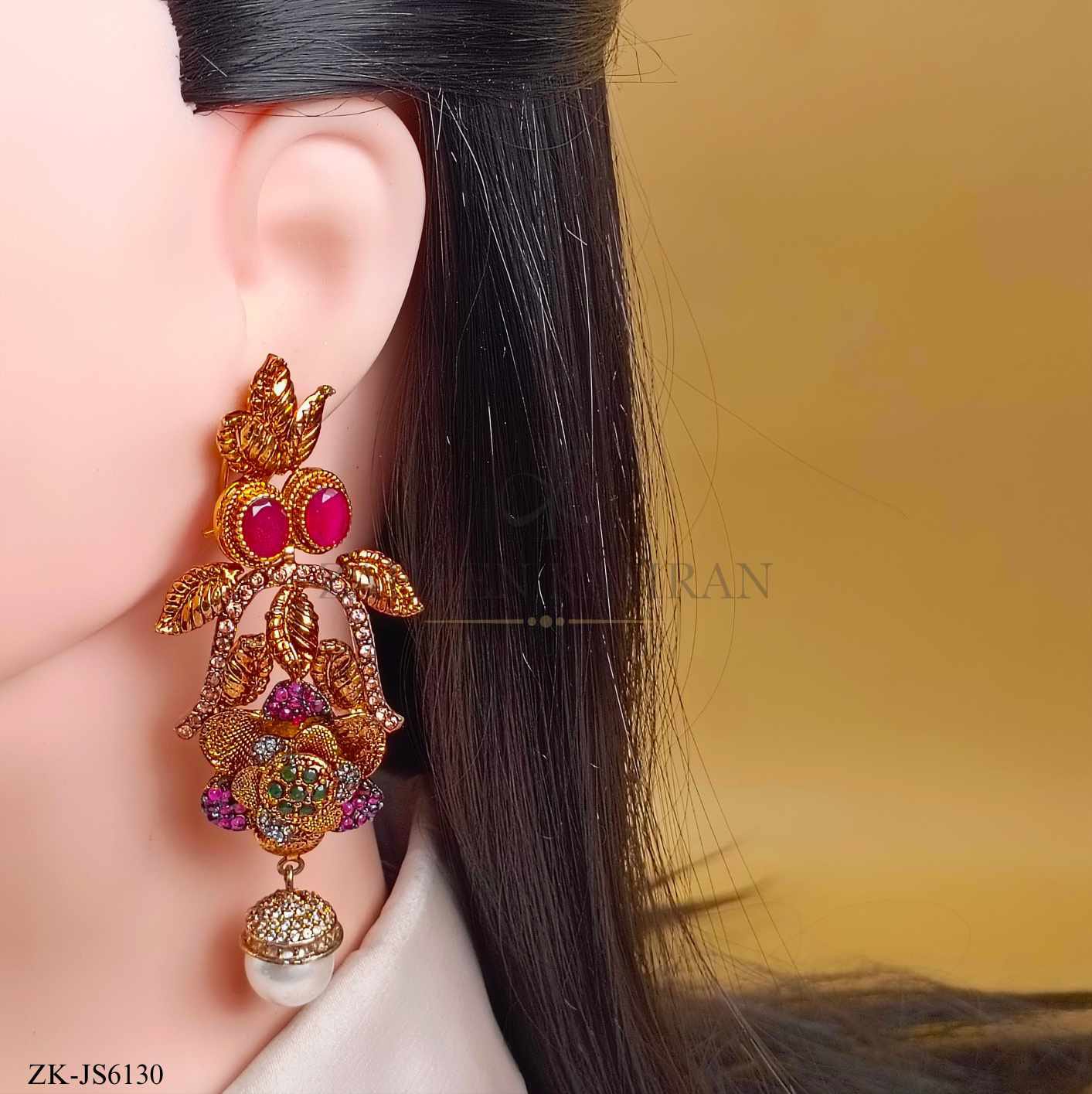 Handcrafted 22k gold plated mala alongside earrings studded with ruby, sapphire, zircons and pearl.