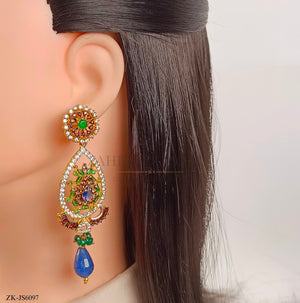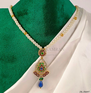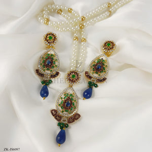Handcrafted 22k gold plated mala alongside earrings studded with sapphire, emerald, coffee stones and pearls.