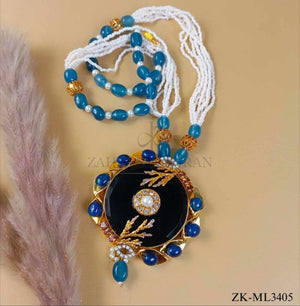 Handcrafted 22k gold plated mala studded with sapphire, black onyx and pearls.
