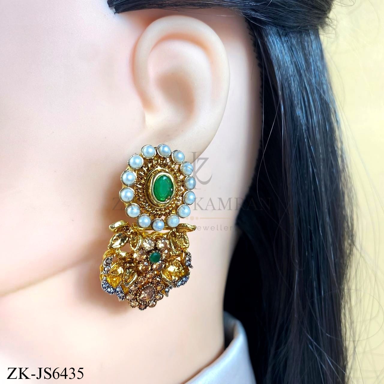 Handcrafted 22k gold plated mala alongside earrings studded with emerald, pearls, smoky and coffee stones.