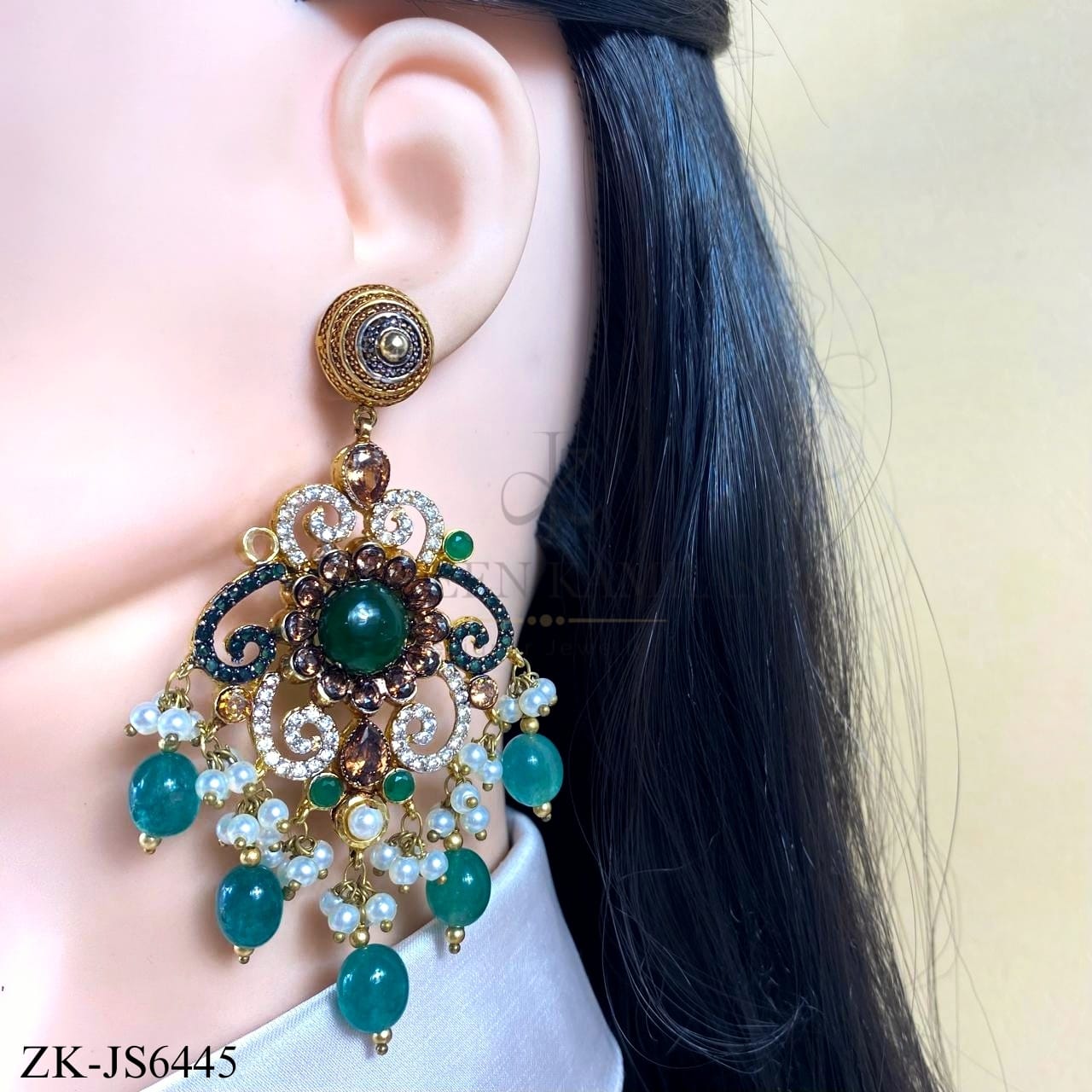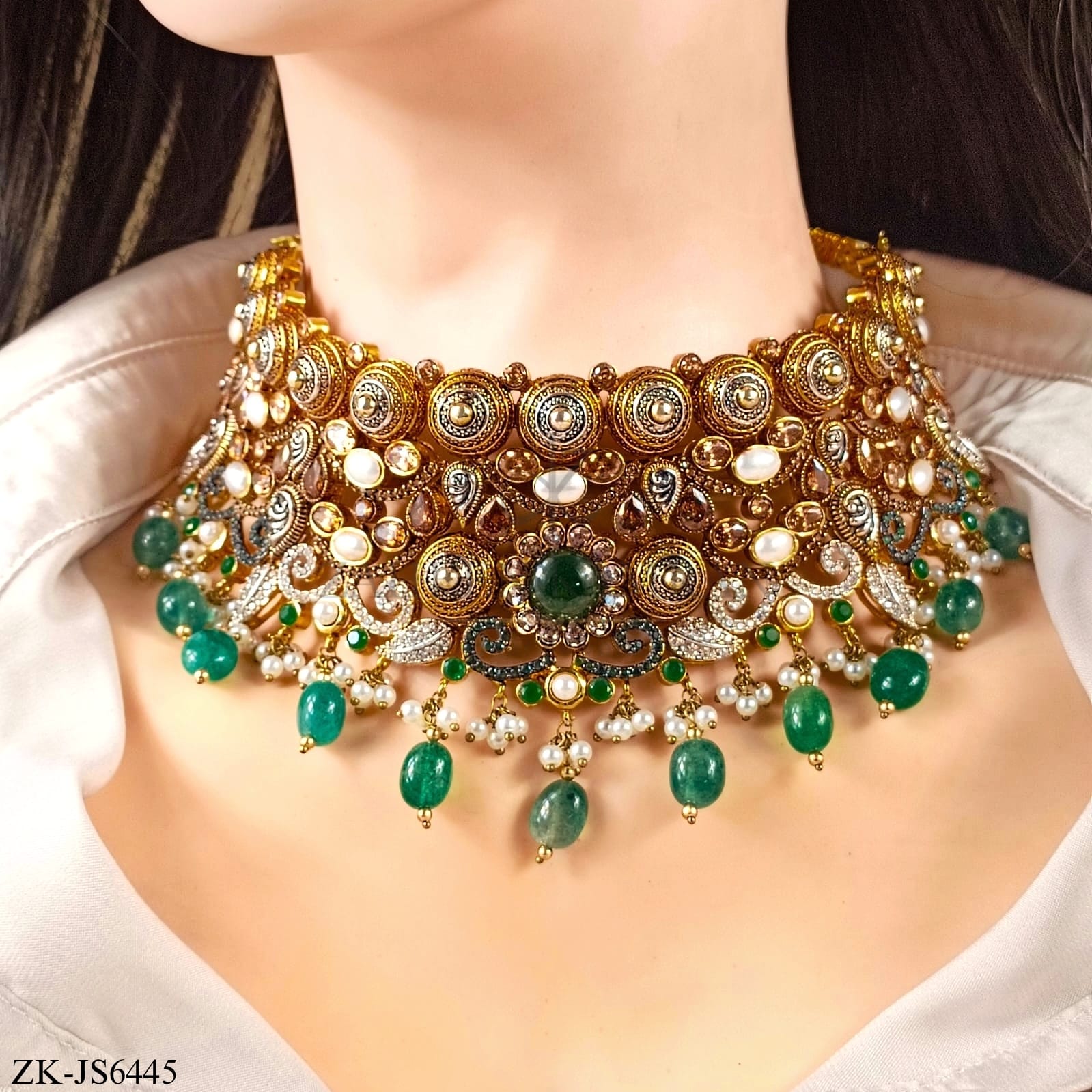 Handcrafted 22k gold plated necklace alongside earrings studded with emerald, pearls, smoky and coffee stones.