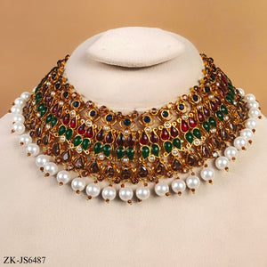 Handcrafted 22k gold plated necklace alongside earrings studded with pink zirconia, emerald, coffee stones and pearls.
