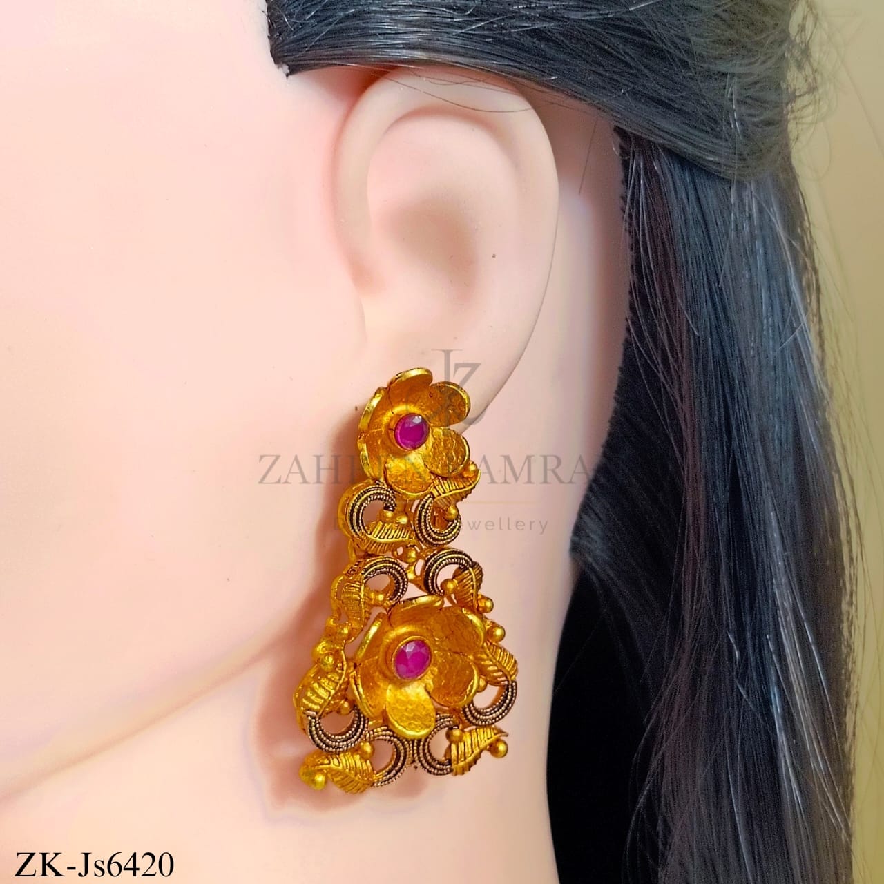 Handcrafted 22k gold plated necklace alongside earrings studded with pink zirconia.