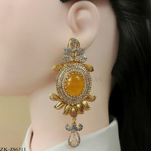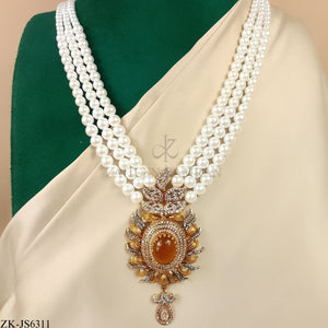 Handcrafted 22k gold plated mala alongside earrings adorned with citrine, zircons and pearls.