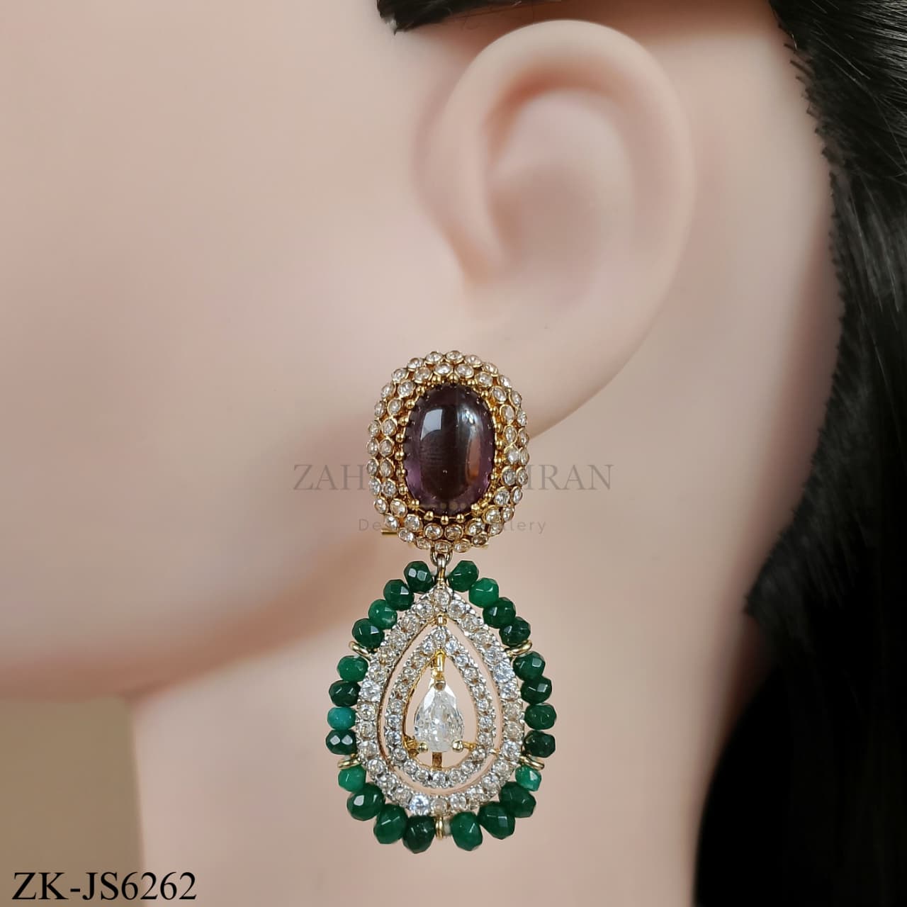 Handcrafted 22k gold plated necklace alongside earrings adorned with garnet, emerald and zircons.