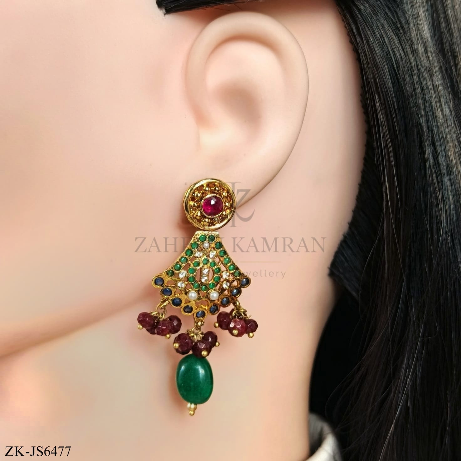 Handcrafted 22k gold plated mala alongside earrings studded with garnet, emerald and pearls.
