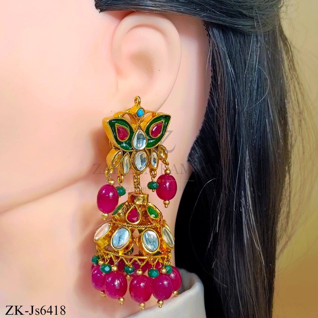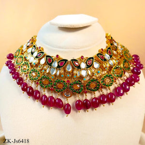 Handcrafted 22k gold plated necklace alongside earrings and tikka studded with pink zirconia, emerald, kundan and green meena.