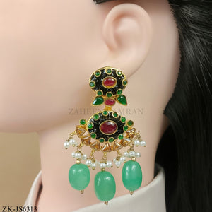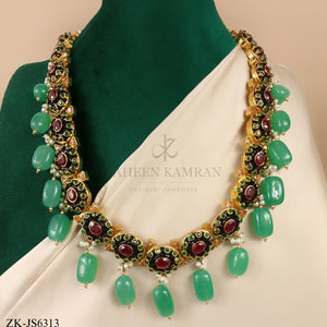 Handcrafted 22k gold plated mala alongside earrings adorned with emerald, garnet and Champagne.