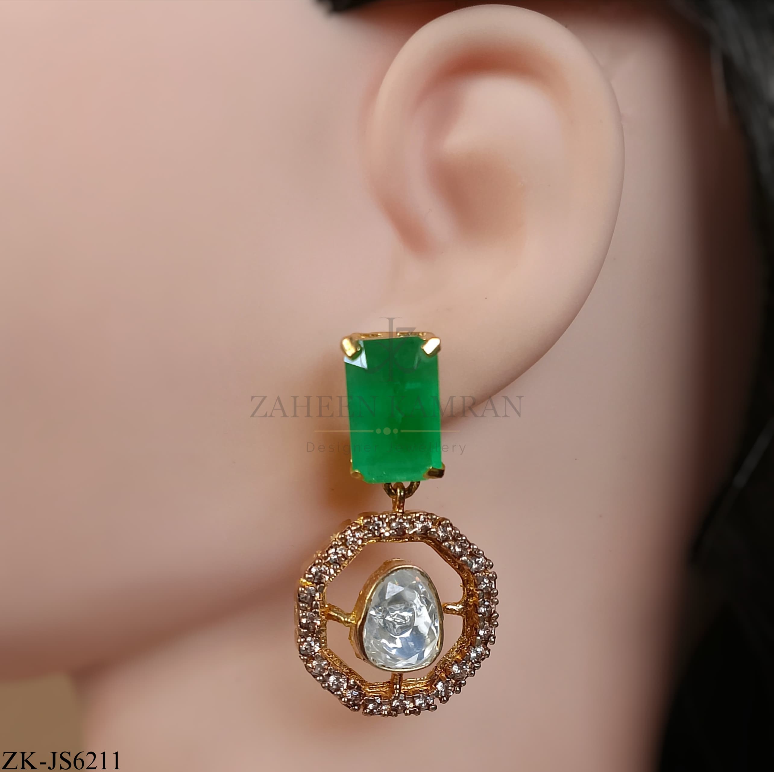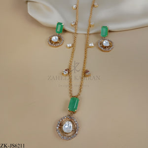 Handcrafted 22k gold plated pendant alongside earrings adorned with emerald, Sheesh and zircons.