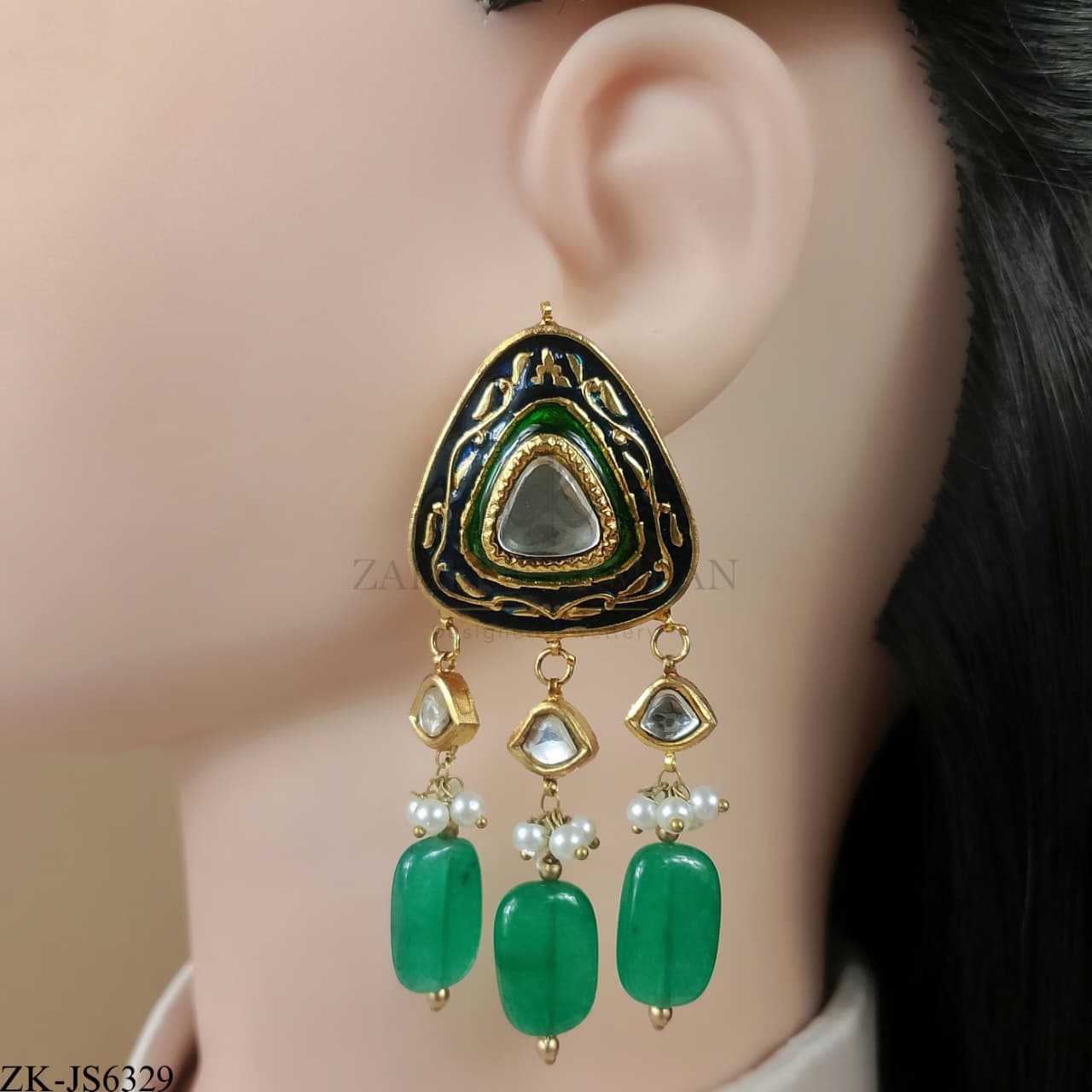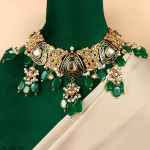 Handcrafted 22k gold plated necklace alongside earrings adorned with emerald, kundan, green meena and pearls.