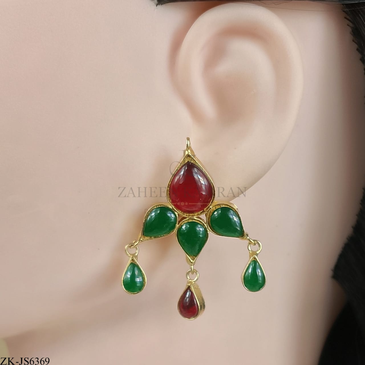 Handcrafted 22k gold plated necklace alongside earrings studded with emerald, garnet, kundan and pearls.