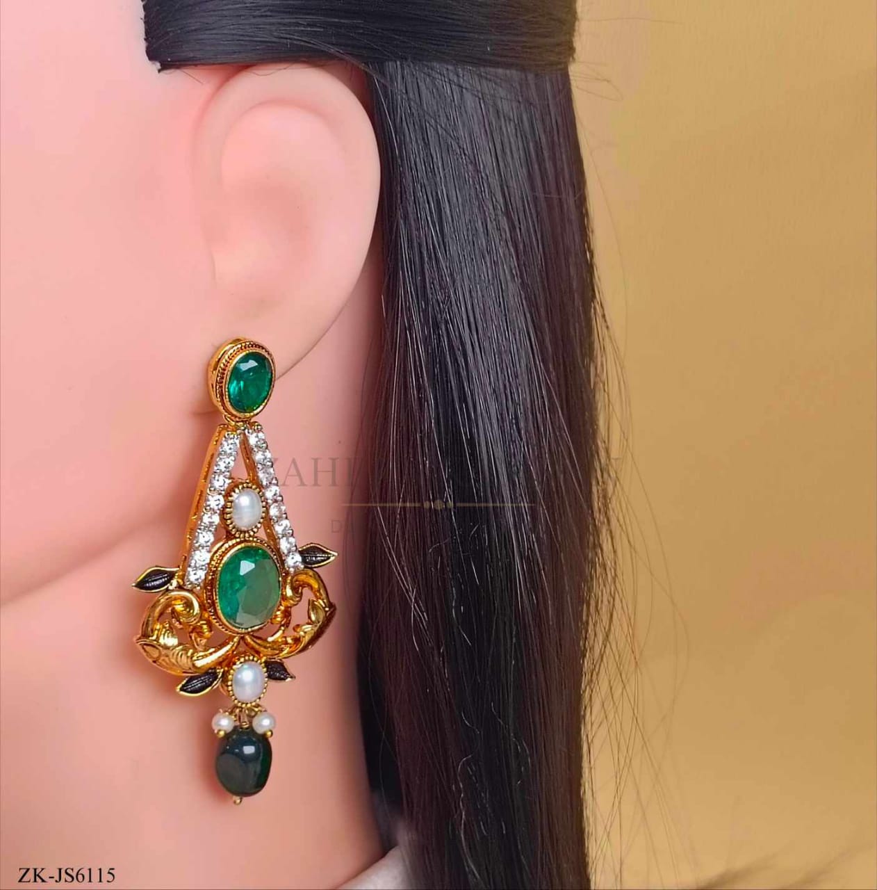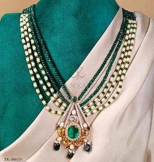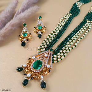 Handcrafted 22k gold plated mala alongside earrings studded with emerald, zircons and pearls.