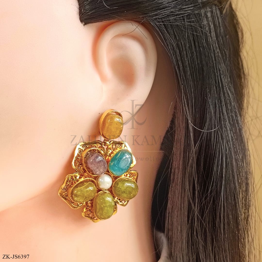 Handcrafted 22k gold plated mala alongside earrings studded with emerald, amethyst, aqua stone and pearls.