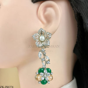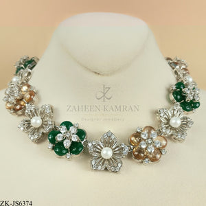 Handcrafted silver plated necklace alongside earrings studded with emerald, champagne, zircons and pearls.