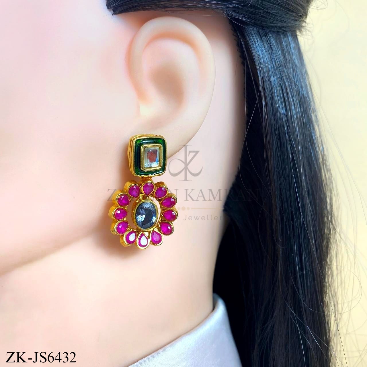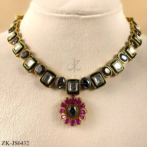 Handcrafted 22k gold plated necklace alongside earrings studded with pink zirconia, smoky stones, Sheesh and green meena