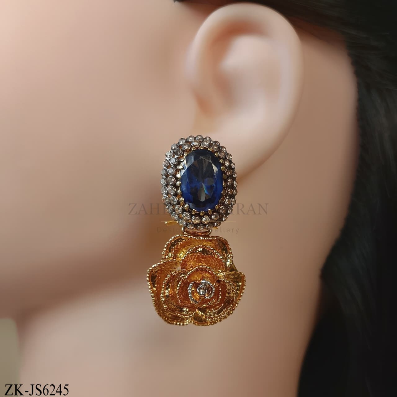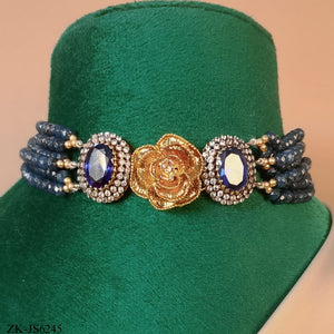 Handcrafted 22k gold plated choker alongside earrings adorned with sapphire and zircons.