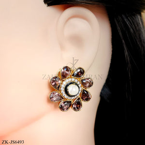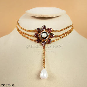 Handcrafted 22k gold plated choker alongside earrings studded with coffee stones, zircons and pearl.