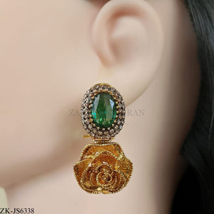 Handcrafted 22k gold plated mala alongside earrings adorned with emerald and Zircons.