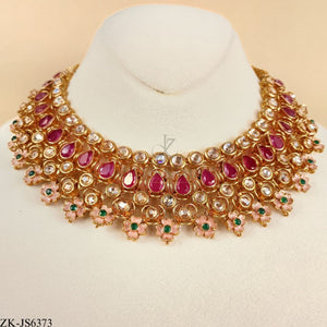 Handcrafted 22k gold plated necklace alongside earrings and tikka studded with pink zirconia, polki, emerald and pink Meena.