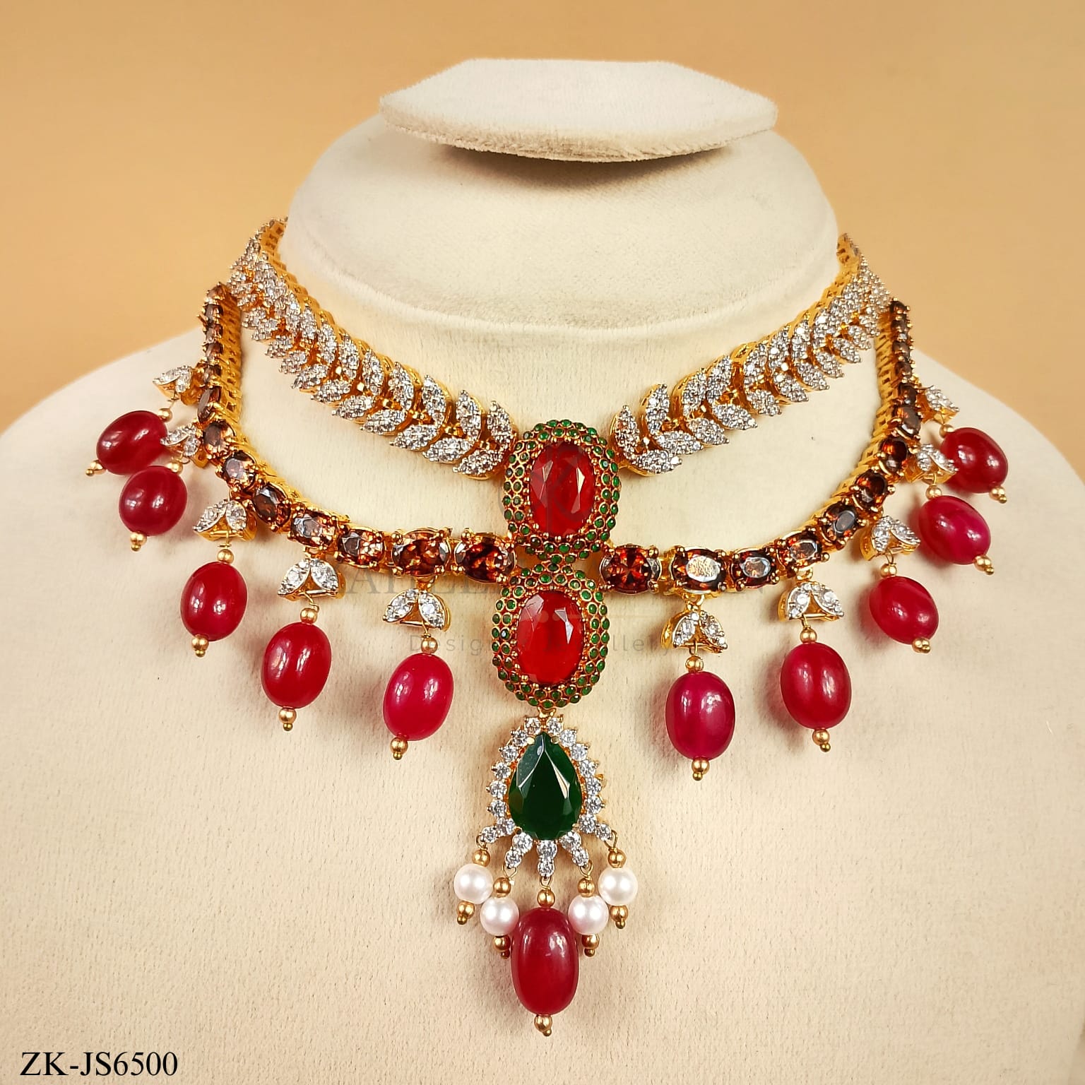 Handcrafted 22k gold plated necklace alongside earrings studded with garnet, emerald, zircons and coffee stones.