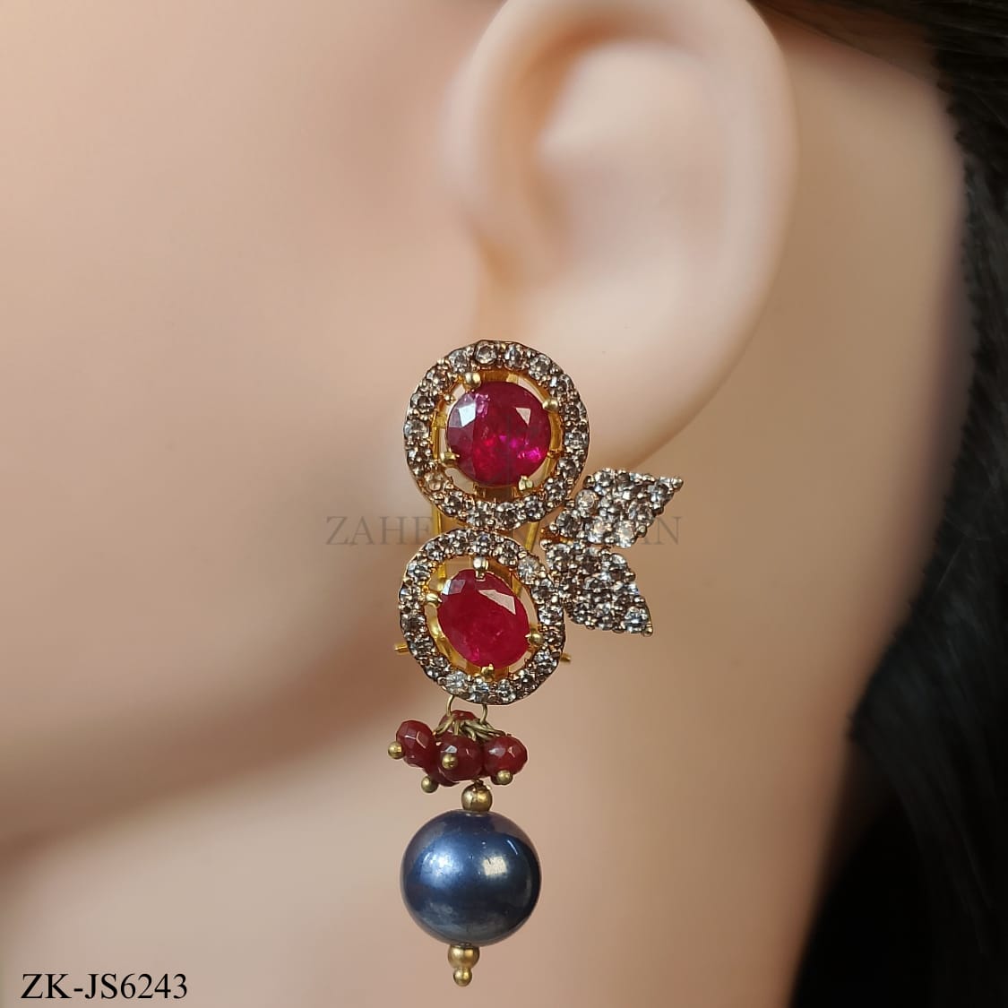 Handcrafted 22k gold plated mala alongside earrings adorned with garnet, sapphire and zircons.