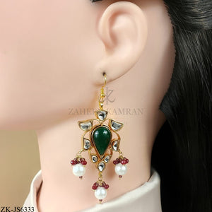 Handcrafted 22k gold plated mala alongside earrings adorned with garnet, kundan, emerald and pearls.