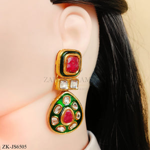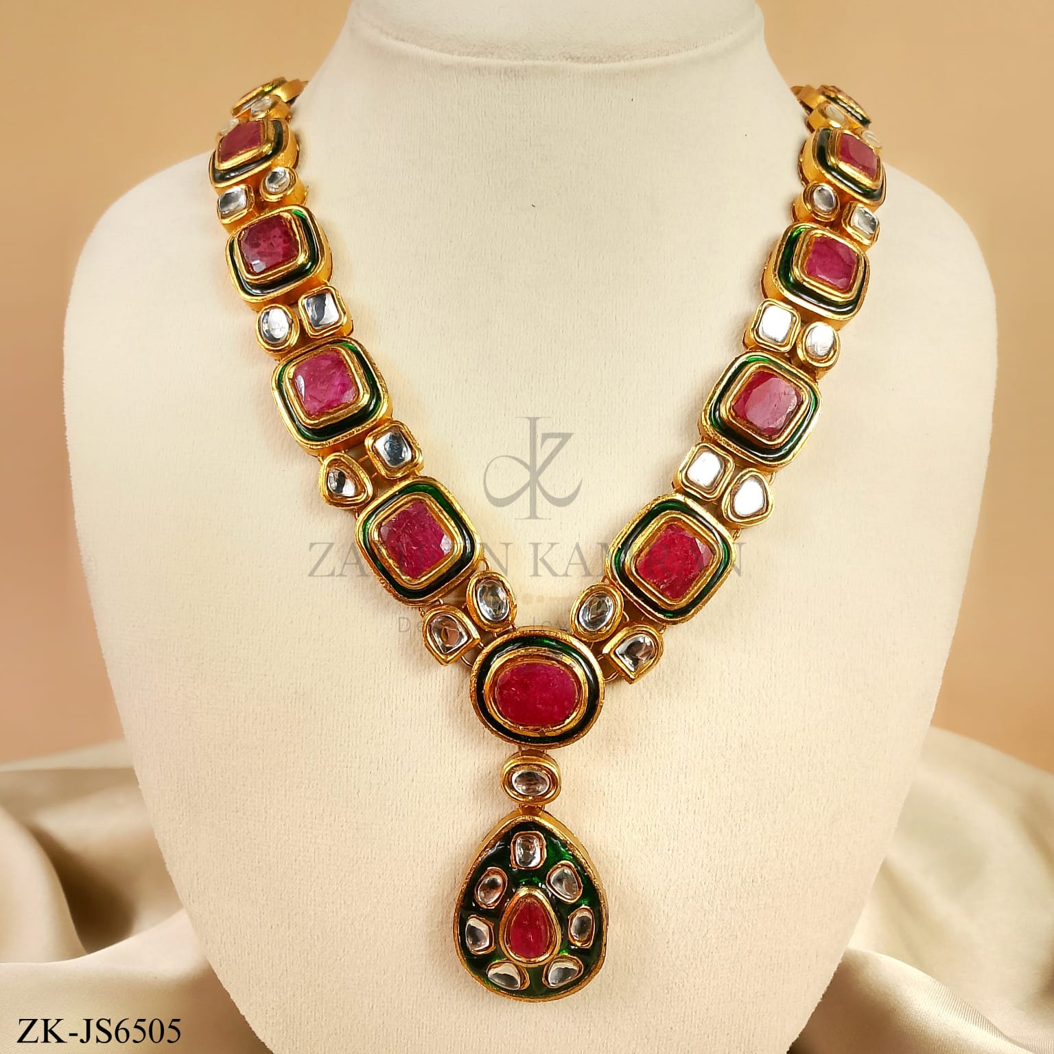 Handcrafted 22k gold plated mala alongside earrings studded with garnet, kundan and green meena.