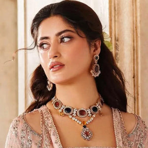 Handcrafted 22k gold plated necklace alongside earrings adorned with garnet, black onyx, Sheesh and zircons.