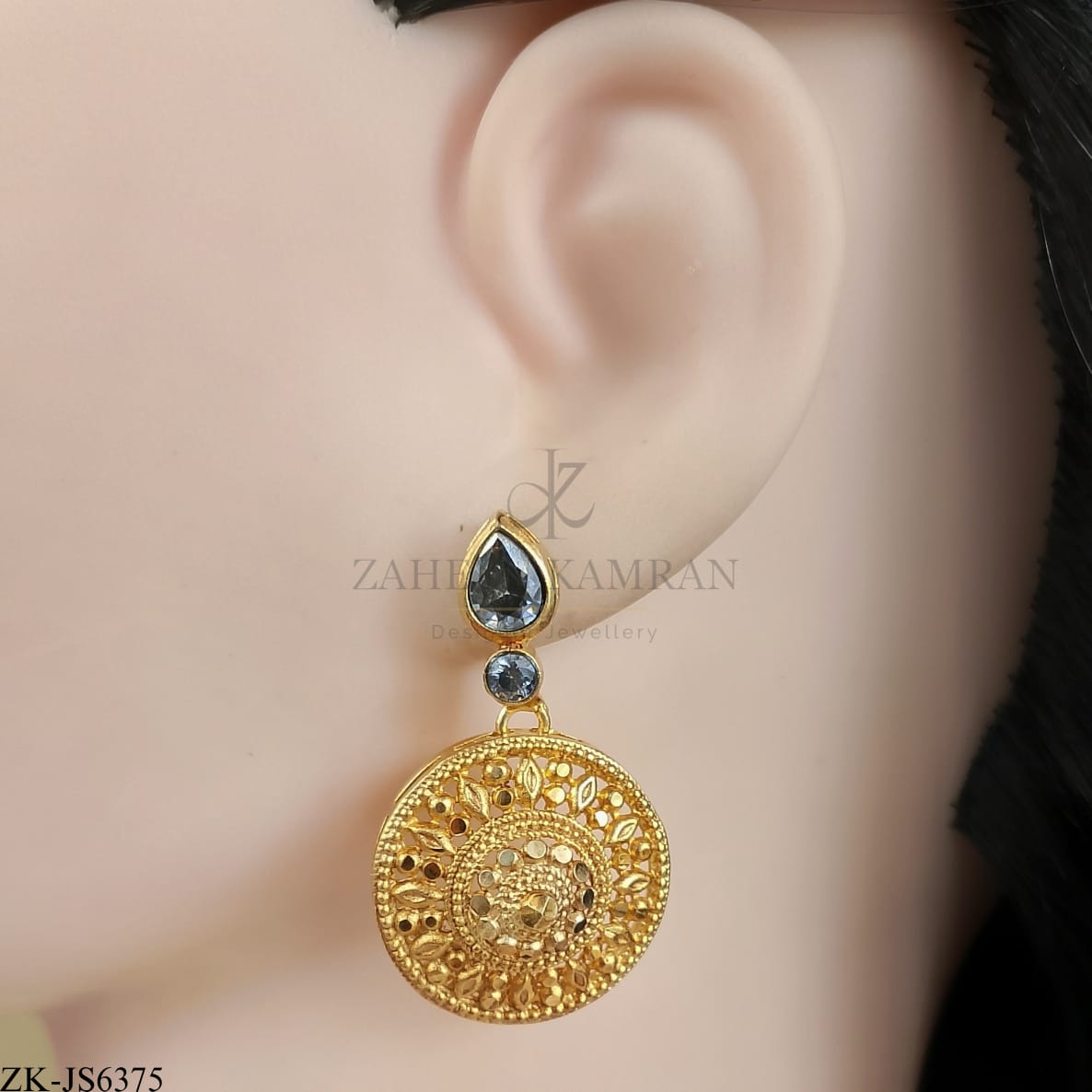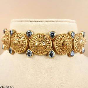 Handcrafted 22k gold plated necklace alongside earrings studded with smoky stones.